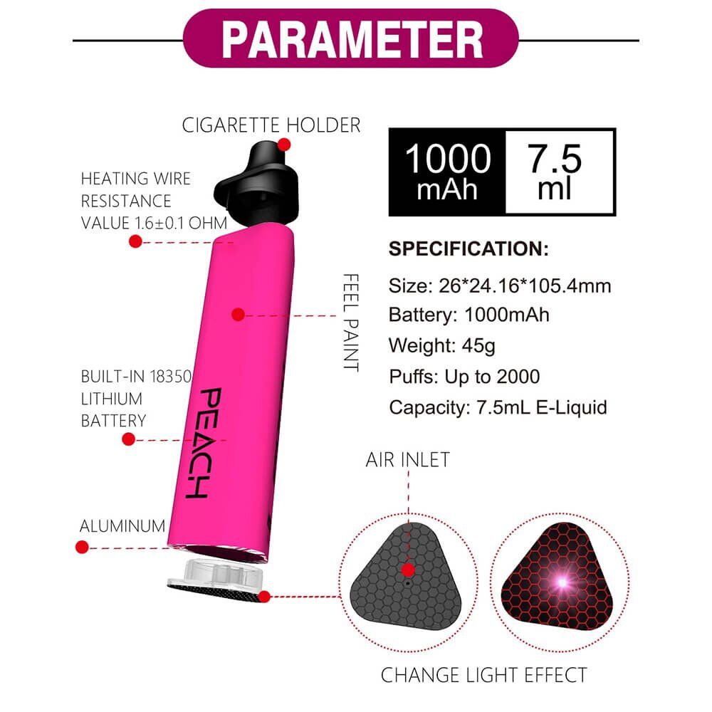 2000puffs Disposable Vape, Equips with 1000mAh Battery and 7.5ml e liquid. Triangle Shape. Many flavors are available. Custom logos are welcome.